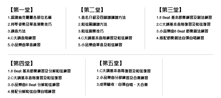 除了讓孩子在短短一周內學會烏克麗麗自彈自唱之外,還能多了解一些簡單的樂理與彈奏技法,並希望能藉由課堂互動的方式,培養孩子對音樂的熱誠與對人的互動,除了可以自彈自唱外,也能與人合奏合唱,一同歡樂上下課,五天後想必就能是個能談能唱的烏克麗麗小樂手。