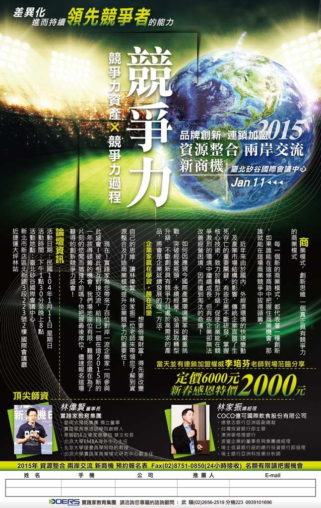 現在!實踐家為您帶來了百位對岸一流企業家一同參與此盛會!彼此相互對接交流,給自己一個在這2015新的一年拔得頭籌的機會,我們場地座位有限,難道您還在為了片刻的悠閒而猶豫不前嗎?快把握最後席位,儘速報名這場難得的創新競爭力盛會!