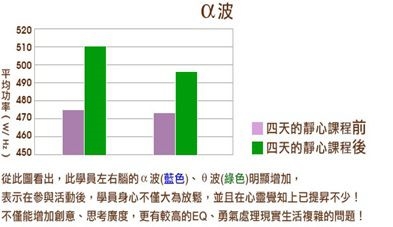 參考資料: 許藝菊、蔡詠淞、劉叡誠,"四天動態靜心課程之腦波與良導絡生理訊號分析",運動生理暨體能學報(ISSN1815-638)第12期。