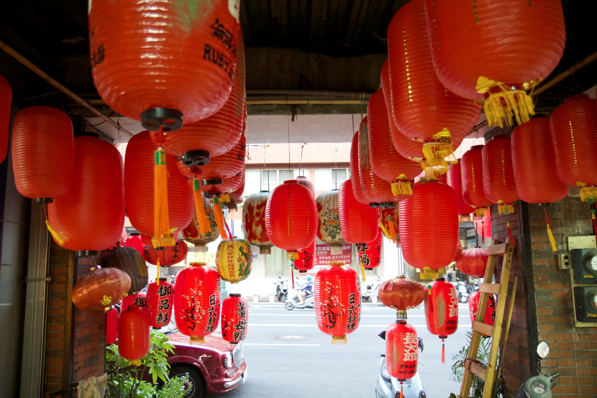 竹製骨架與布製的燈籠店家,