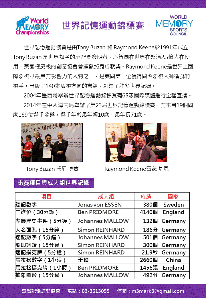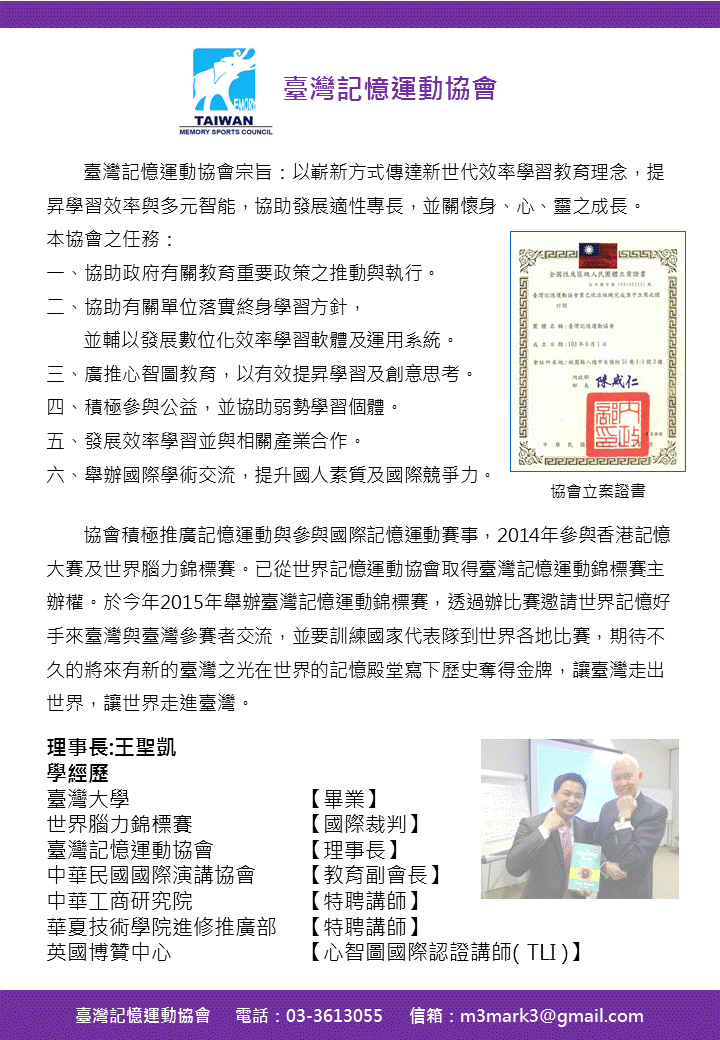 - 指導單位:桃園市教育局、桃園市青年事務局、世界記憶運動協會 主辦單位:社團法人臺灣記憶運動協會、心智圖教育學院