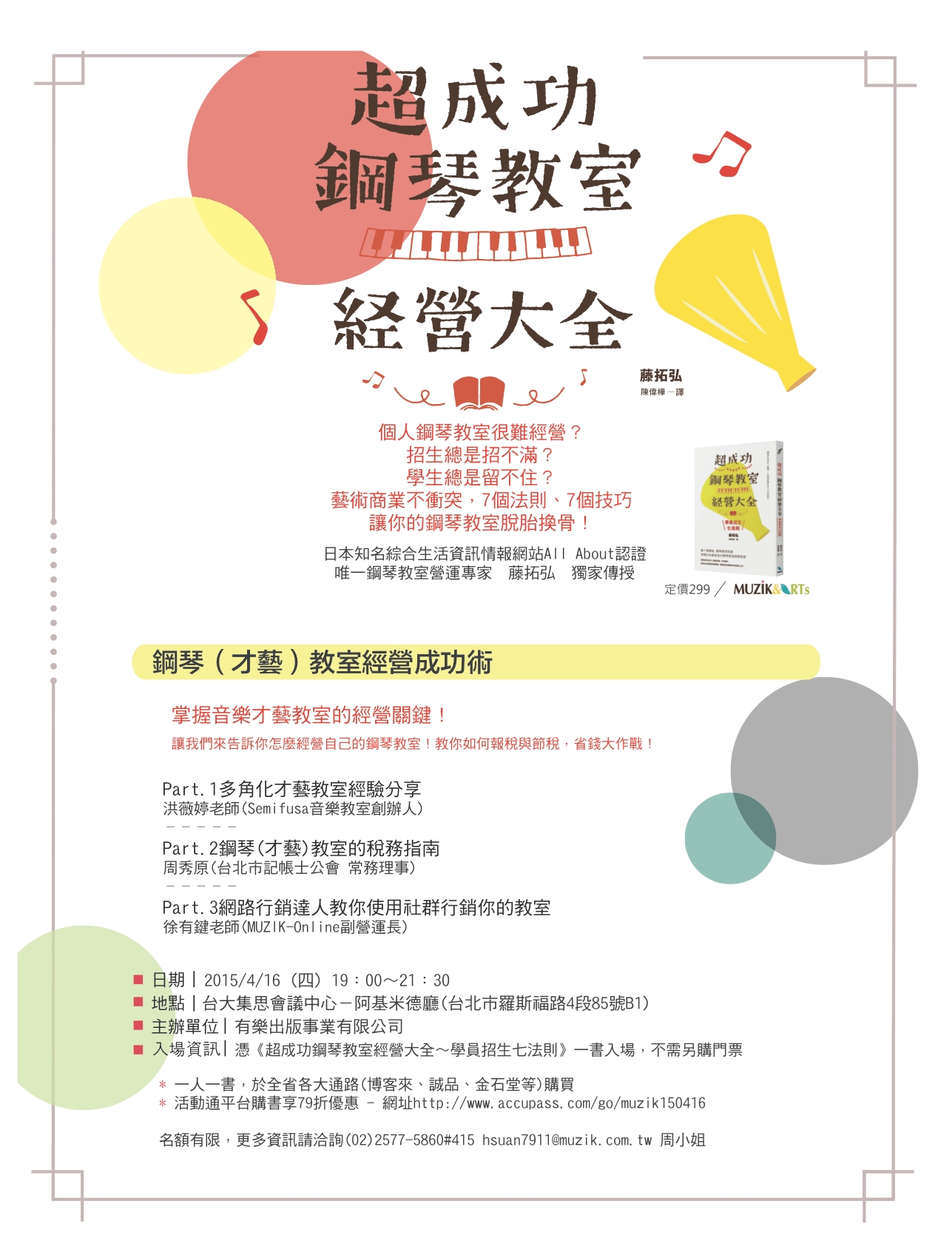 憑《超成功鋼琴教室經營大全~學員招生七法則》一書入場,不需另購門票