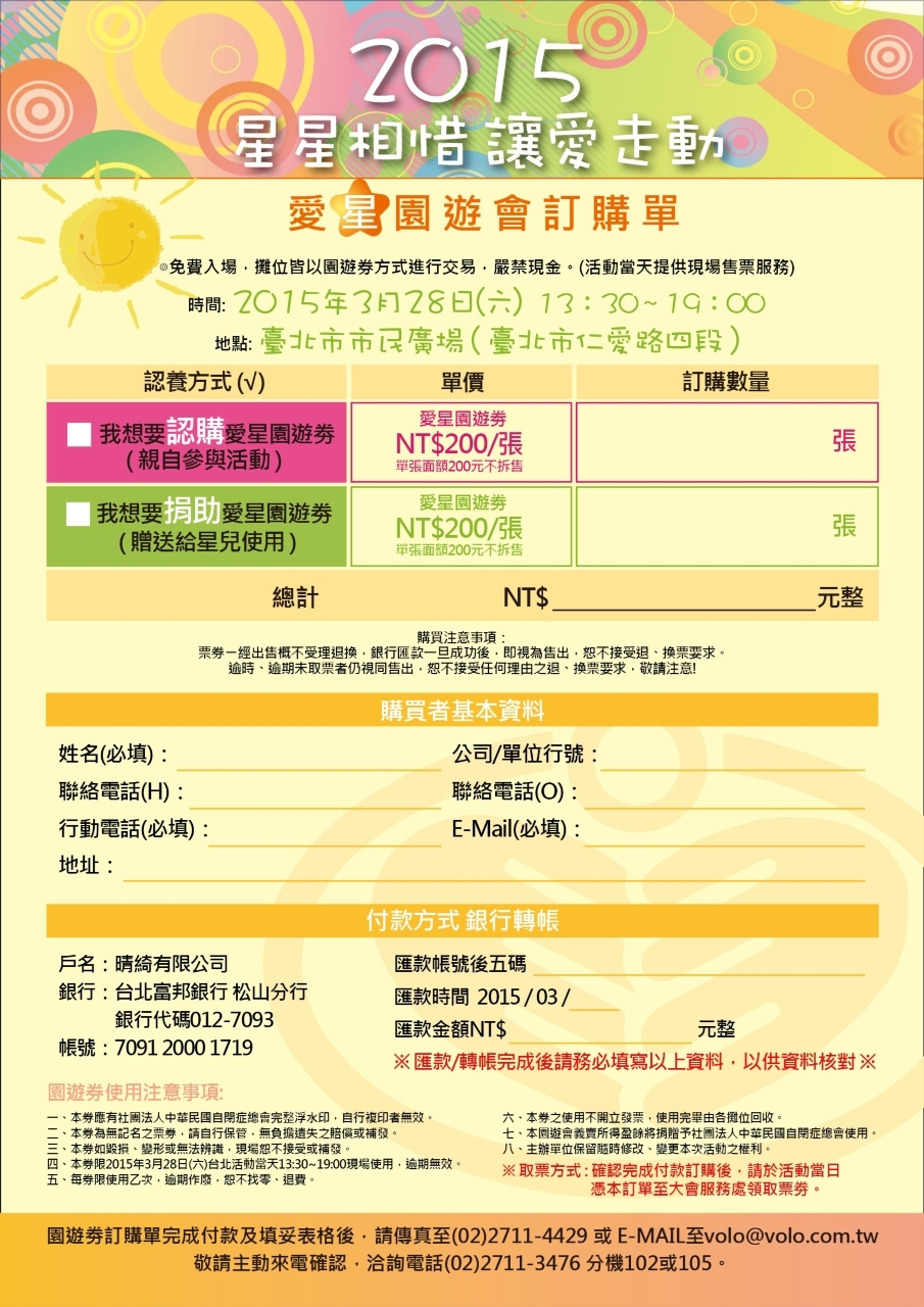 步驟五: 園遊劵訂購單完成付款及填妥表格後,請傳真至(02)2711-4429 或 E-MAIL至volo@volo.com.tw