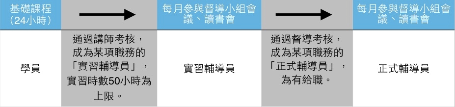 2. 聘⽤期間,必須參與每月由諮商心理師帶領之督導會議及讀書會,並完成指定讀物。 3. 經督導評估,輔導員符合該項職務的專業要求,則擔任「有給職」工作。