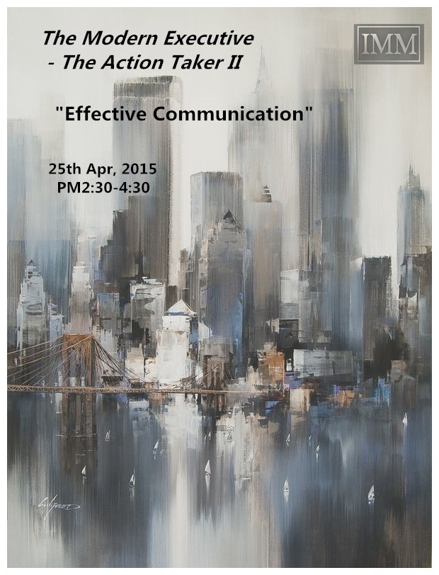 目前國際上許多知名企業如Apple, Starbucks, Alibaba(阿里巴巴)等皆認同”員工”為傳承企業文化的最佳資產,因此提升員工職場軟實力"更是這些知名企業在內部HR訓練項目中一項很重要的規劃。IMM繼上次針對在舉辦了"The Modern Executive – Action Taker Worksop後,引進當下美國最流行的職場training分享,獲得熱烈迴響,本次將延續上次的主題針對Action Taker 另一項必備技巧”Effective Communication有效溝通”作更進一步的介紹,歡迎在職場上也想成為Action taker的朋友一同來參與討論,機會難得,講師分享將以英語進行,互動討論則以中英雙語並行,對培養自身職場軟實力有興趣的朋友千萬不要錯過唷!!