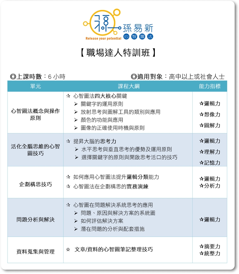 並配合心智圖(Mind Map)作為圖解思考工具,能同步有效提升個人的思考力、創新力與企劃力。