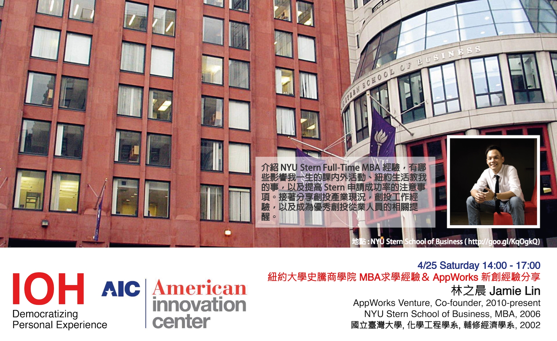 IOH 此次邀請 AppWorks 之初創投創辦人 Jamie 林之晨,分享其於美國東岸名校紐約大學史騰商學院( NYU Stern School of Business)MBA 的求學心得,並分享給學弟妹申請紐約大學的獨家秘訣。此外,身為 AppWorks 創辦者的 Jamie,如何透過以往創業與商學院學習經驗完成其 AppWorks 的大業 ─ 推動台灣成為世界一流的網路產業聚落。其長年創業創投親身體會,等著給各位台灣熱血創業青年挖掘!