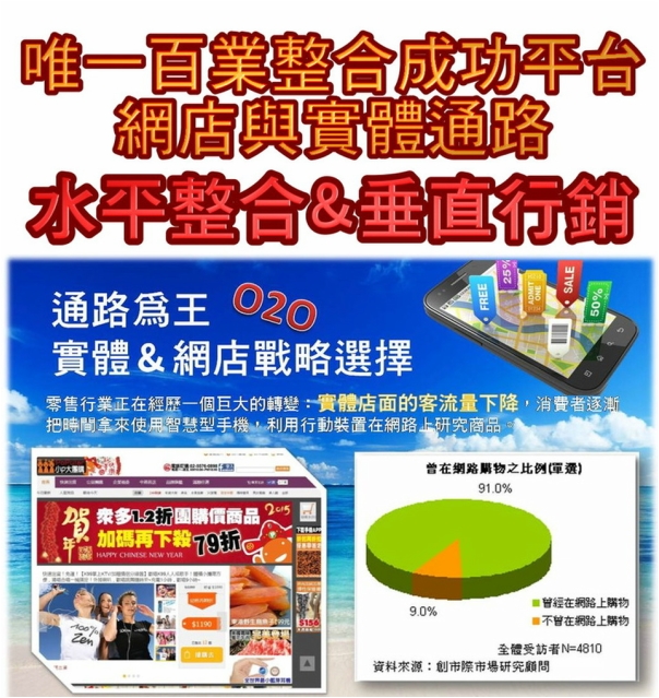 庶民經濟時代來臨~團購市場在台灣每年飆破百億,加上<眼球效應><指尖經濟>帶動全球移動電子商務大爆發,9成以上的人曾在網路購物,團購更為消費者及商家創造雙贏,線上及實體O2O垂直營銷結合團購模式,將掀起另一波兆元電子商務財富革命!