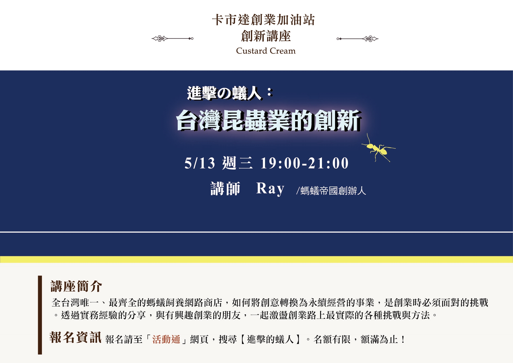 全台灣唯一、最齊全的螞蟻飼養網路商店,如何將創意轉換為永續經營的事業,是創業時必須面對的挑戰。透過實務經驗的分享,與有興趣創業的朋友,一起激盪創業路上最實際的各種挑戰與方法。