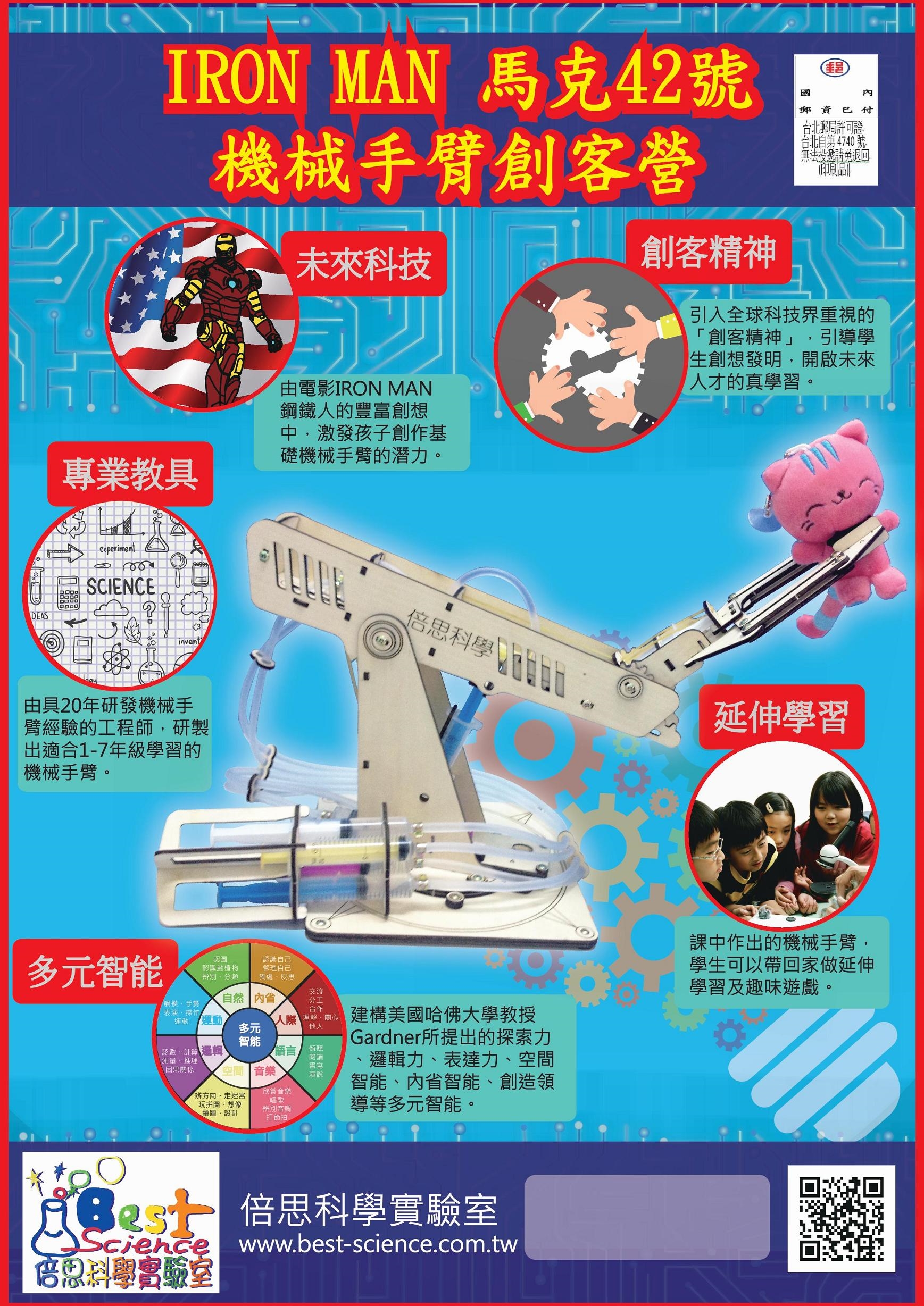 「Iron Man馬克42 機械手臂創客營」運用真實的學具,透過專業師資及教具激發小創客對未來科技的想像,也開啟多元智能,每週末90分鐘讓「倍思科學實驗室」待領1-7年級的學童,一起進入馬克42機械手臂的趣味生活裡。