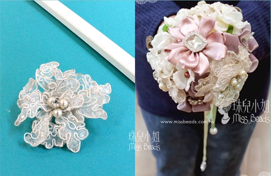 每一朵一朵不論是緞帶花、蕾絲花兒、花片花兒,為每一朵美麗點綴上珠珠、水晶、鑽式,唯美的捧花就快要完成囉!