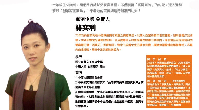 四年前,林奕利到美國攻讀碩士,卻因心律不整,耐不住北美嚴寒,一個月就打道回府。當時,網路購物市場剛起步,她心中創業的欲望燃起,因為全家都嗜好美食,爸爸做的香腸又美味。於是,「奕利的店」就此在雅虎奇摩上開張,賣香腸。
