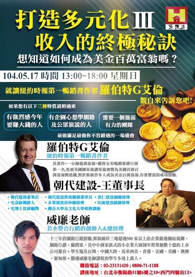對於幫助許多人成為美金百萬富翁有著豐富的成功經驗。他個人認為,一個人要打造多元收入是相當重要的,而他花了35年的時間去研究與實踐如何打造多元化的收入,也成功的在房地產、網際網路、組織行銷、教育訓練...不同領域創業致富。
