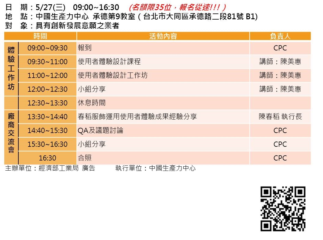 日 期:5/27(三) 09:00~16:30 (名額限35位,報名從速!!!)