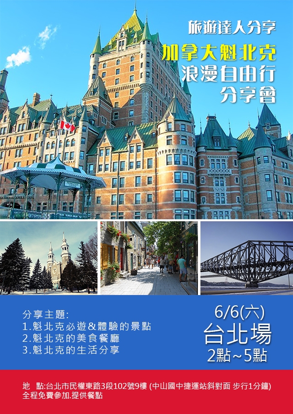 的分享會,讓各位可以認識到了魁北克一定要去哪些景點,已及魁北克的美食一定不能錯過! 邀請各位喜歡旅遊的朋友