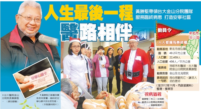 而就任台大醫院金山分院院長的期間,黃勝堅醫師與老人家談往生:「阿公,你要做仙的時候,希望留在我們醫院,還是送你到大醫院?」老人家卻回他說「不要,我要留在家裡。」然而黃勝堅想到的卻是末期病人留在家中,沒有醫院的儀器,醫護人員怎麼照顧他們最後的日子?病人留給他這樣的難題。