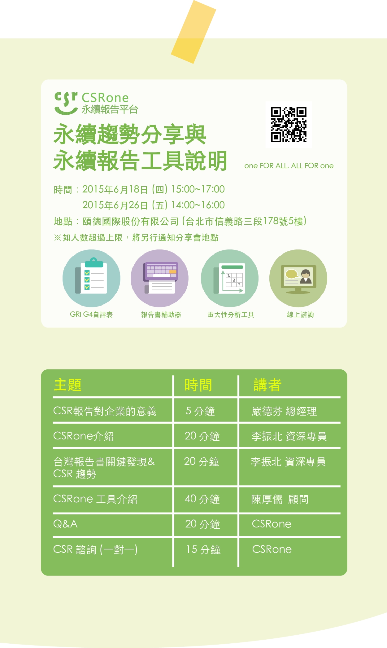 費用含茶水、講師、場地租賃使用費,同時贈送『2014台灣CSR報告現況與趨勢分析報告書』及『白金試用帳號一星期』