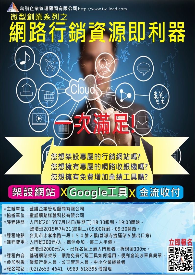 暑假到了,想學習如何利用利器,讓自己做好產品行銷嗎?不要猶豫,來報名藏鑽企管所開設的(網路行銷資源即利器)基礎及進階班吧。