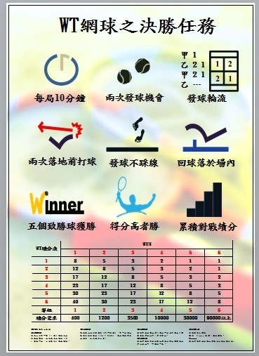 WT規則:採取第一人先發一次,之後都發兩次,時間10分鐘,獲得分數較多者為勝方,