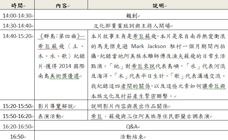 文化部華山小客廳7月4日(週六)將由資策會策畫舉辦《群島:第四曲》—希巨蘇飛〈土、木、水、歌〉紀錄片發表會與交流體驗活動,這部片是由住在台東多年,來自南非熱愛衝浪的馬克傑克遜(Mark Jackson)所拍攝的紀錄片,這部片是馬克紀錄當地阿美族藝術家及漁夫希巨蘇飛的日常生活點滴。「土」對希巨來說代表島嶼,「水」代表河流及海洋,「木」代表平日生計、「歌」代表溝通交流。本片紀錄這四者間的關係,以及這些元素如何讓希巨與阿美族文化及村莊產生緊密聯繫。從外國人的眼光來看都蘭地區原住民藝術家對土地、海洋、漂流木的關係,而阿美族人的都蘭古調傳唱則成為溝通的橋樑。