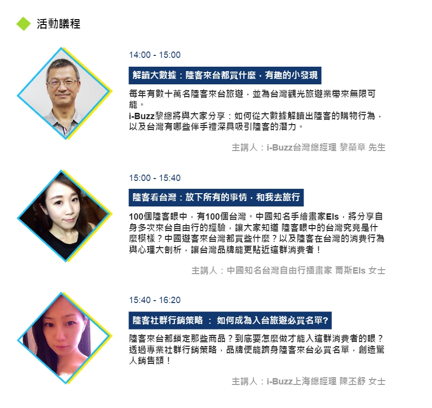 我們邀請到熱愛來台自由行的知名中國圖文部落客Els、i-Buzz台灣總經理黎榮章先生,以及i-Buzz上海總經理陳丕舒女士