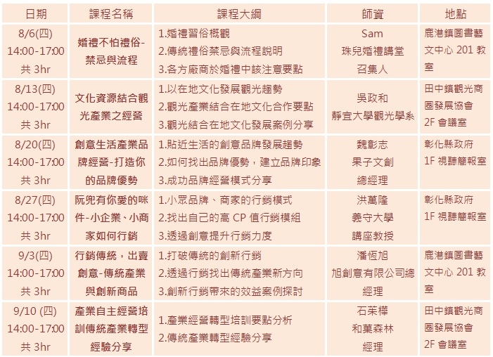 1.透過辦理產業經營提升課程,讓學員對於幸福產業未來發展趨勢與方向更加明確,以利於推動在地幸福元素,並凝聚彰化縣幸福產業發展意識。