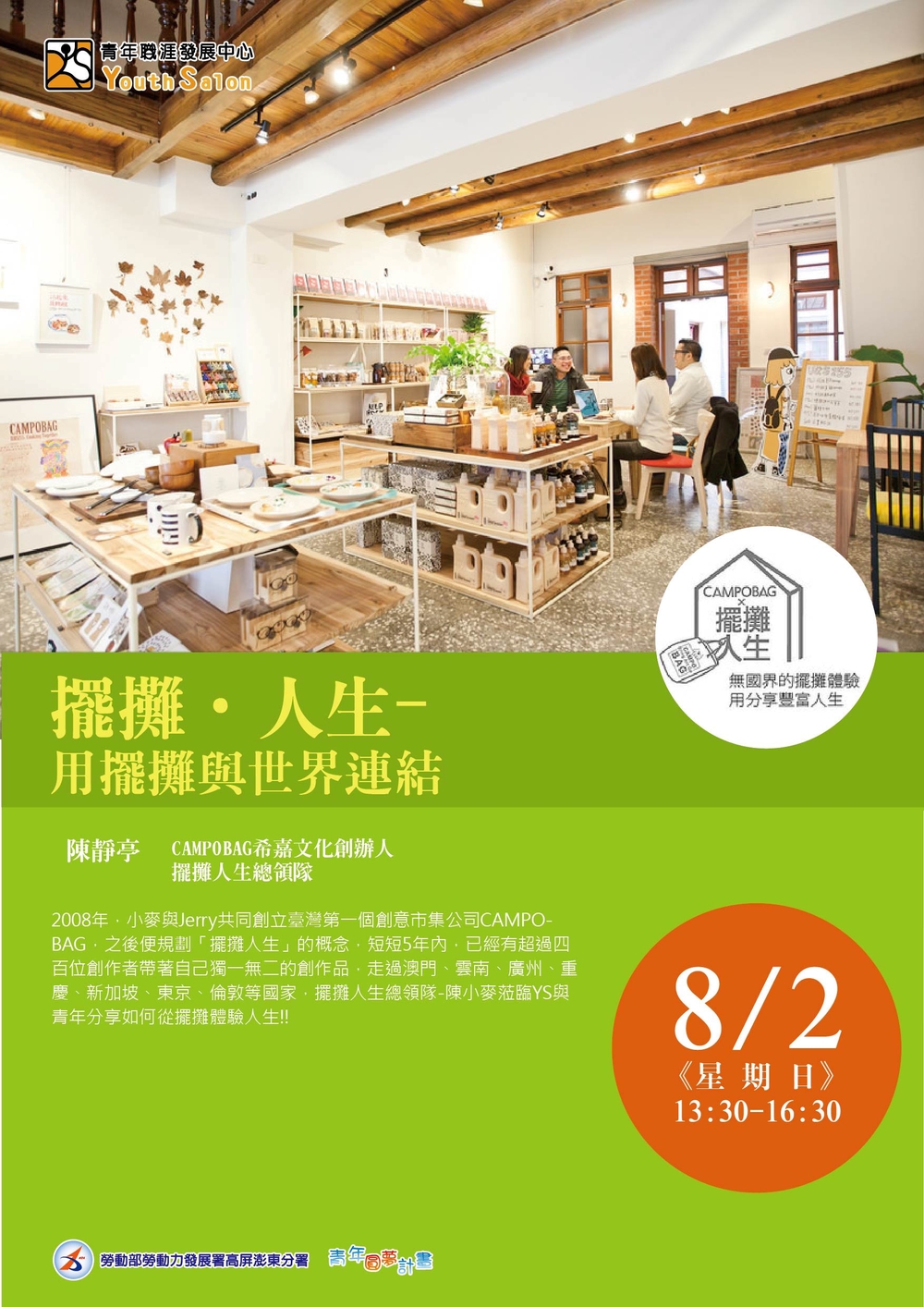 2008年,小麥與Jerry共同創立臺灣第一個創意市集公司CAMPOBAG,之後便規劃「擺攤人生」的概念,短短5年內,已經有超過四百位創作者帶著自己獨一無二的創作品,走過澳門、雲南、廣州、重慶、新加坡、東京、倫敦等國家,擺攤人生總領隊-陳小麥蒞臨YS與青年分享如何從擺攤體驗人生!!