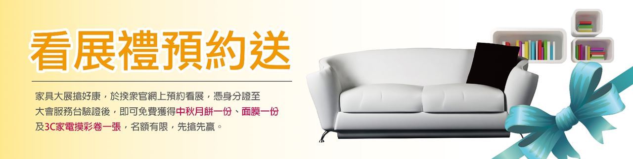 家具大展搶好康,於揆眾官網上預約看展,憑身分證至大會服務台驗證後,即可免費獲得中秋月餅一份、面膜一份及3C家電摸彩卷一張,名額有限,先搶先贏。
