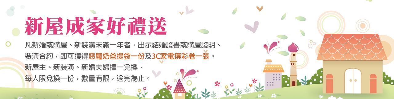 凡新婚或購屋、新裝潢未滿一年者,出示結婚證書或購屋證明、裝潢合約,即可獲得惡魔奶爸提袋一份及3C家電摸彩卷一張。新屋主、新裝潢、新婚夫婦擇一兌換,每人限兌換一份,數量有限,送完為止。