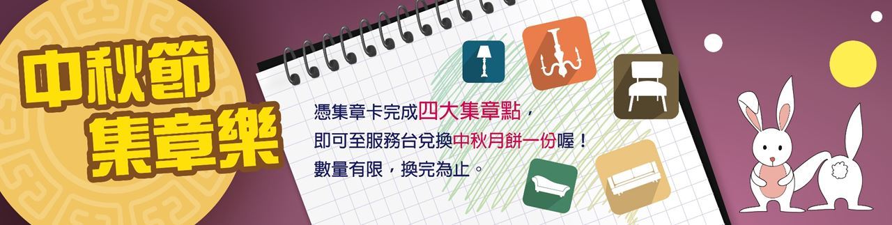 憑集章卡完成四大集章點,即可至服務台兌換中秋月餅一份喔!數量有限,換完為止。