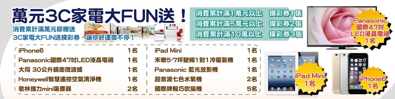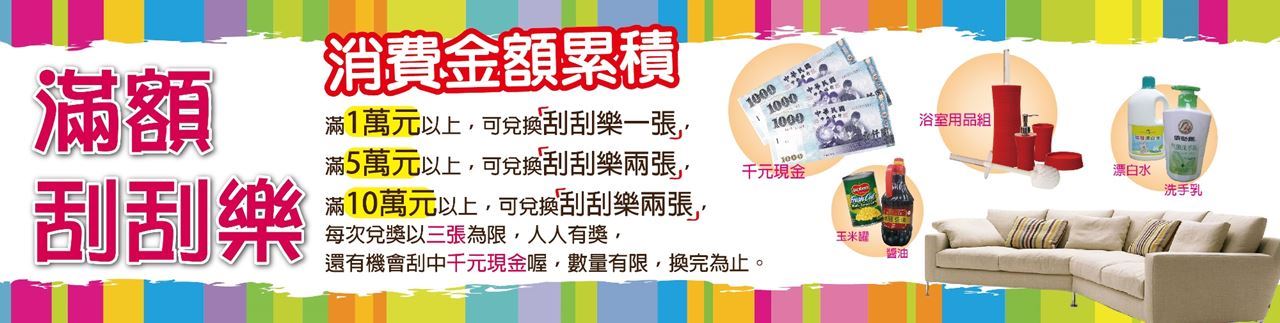 消費金額累積滿1萬元以上,即可兌換刮刮樂一張,5萬元以上可兌換兩張,10萬元以上三張,每次兌獎以三張為限,人人有獎,還有機會刮中千元現金喔,數量有限,換完為止。