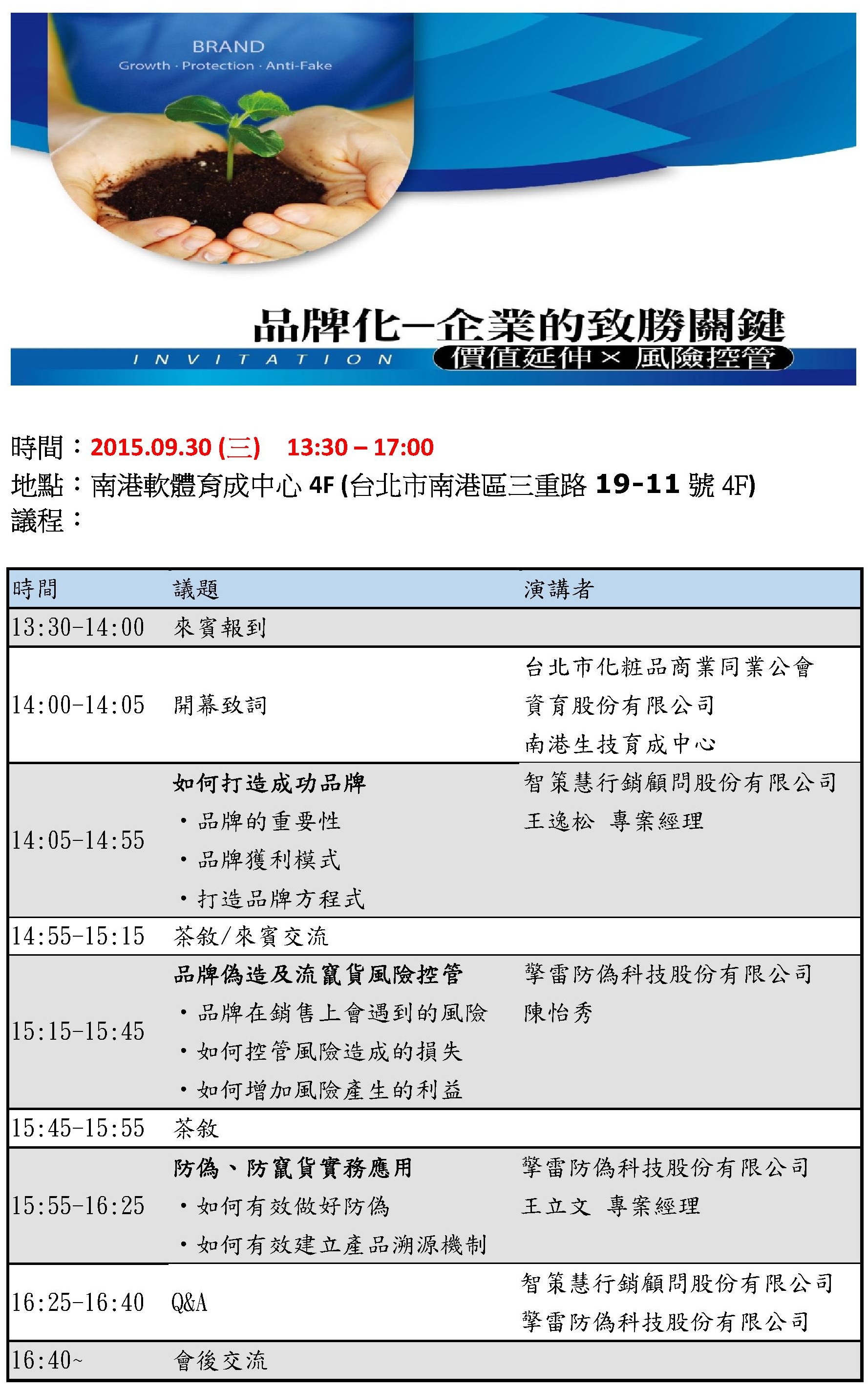 於9/30(三) 13:30 ~ 17:00,在南港軟體育成中心聯合舉辦『品牌化-企業的致勝關鍵』研討會: