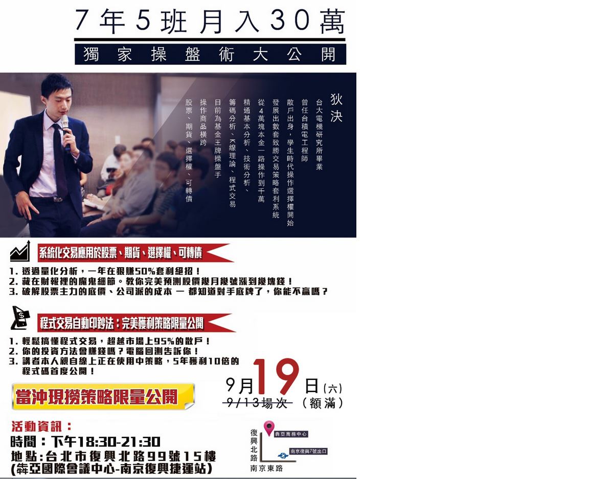 限時免費! 9/19(六) 七年五班月入三十萬 實戰交易分享會