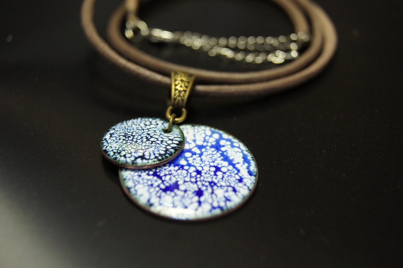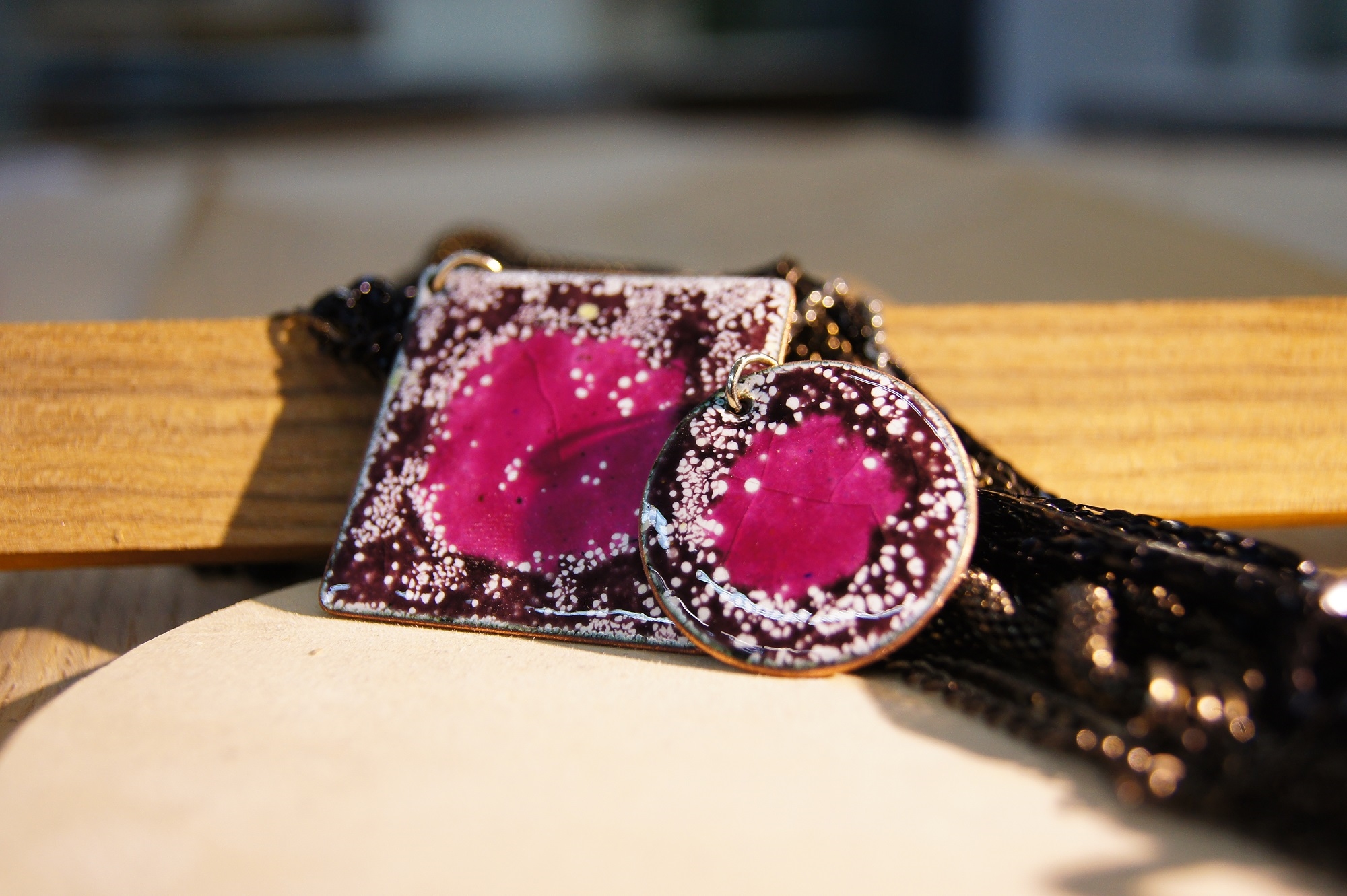 利用不同窯燒溫度控制,產生不同噴點效果,在金屬銅片上創作者搭配不同色彩,設計出屬於自己的琺瑯墜飾。