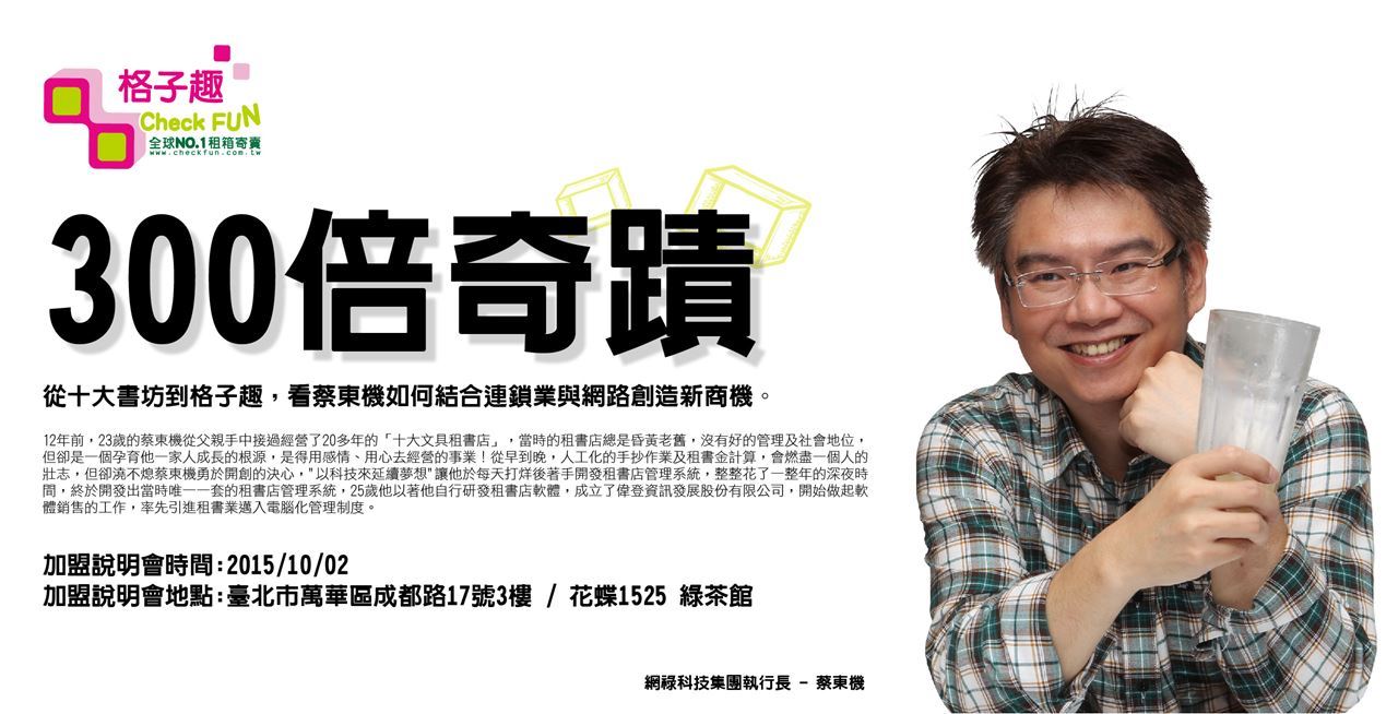 格子趣是全台首創租箱寄賣第一品牌,app電子商城的規劃,蔡東機再次結合連鎖業及網路創造商機,強大的推播系統與廠商、加盟主及消費者連成一線緊密的互動,再次創造出.....
