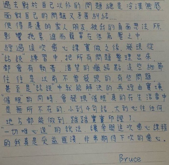 癒心術總論 ´ 人心八層次 ´ 改變的階段 ´ 心在哪? 為何生病? ´ 記憶痛苦怎麼生? ´ 苦痛帶來的九種病相 ´ 壓力病徵與處理 ´ 癒心師不可有的十種過患 ´ 心如何回到真善美 ´ 難以出離的軌道 ´ 讓心歸零 ´ 懺悔文 ´ 四大催眠類別 |