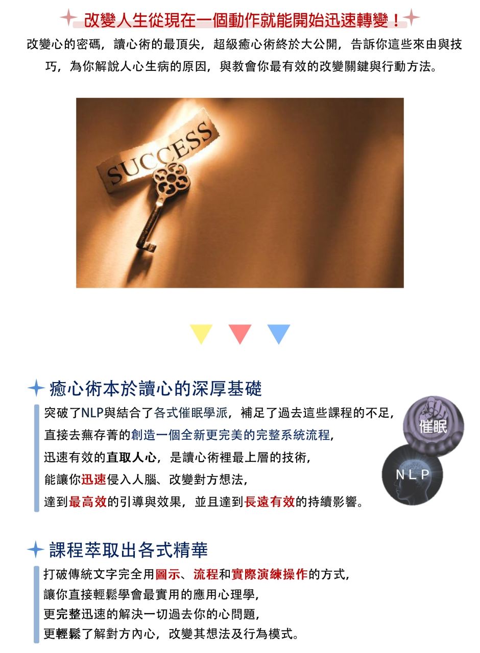 癒心術本於讀心的深厚基礎,結合NLP與催眠,創造全新且更完善的<改變癒心系統流程>,有最完整的操作方法、最巨細靡遺的實作練習。用圖示、流程和實際演練,讓你輕鬆快速學習、精準的對症下藥,解決一切心理問題,更輕鬆了解對方內心,改變其想法及行為模式。讓你在生活、職場、人際、家庭與愛情無往不利,創造超完美的人生,加入人生勝利組吧!