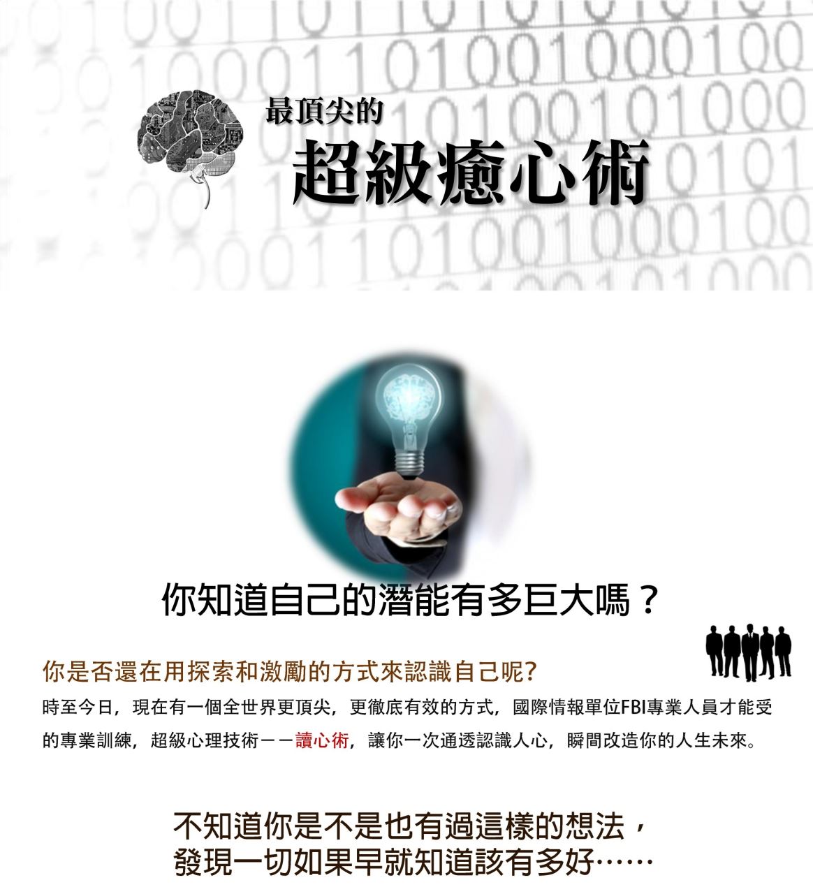 催眠設計 ´ 進入腦世界 ´ 快速催眠八步驟 ´ 瞬間催眠 ´ 催眠測試 ´ 五感編碼 ´ 製造記憶 ´ 業力注意 ´ 催眠四大解法與角度 ´ 釋放壓力建立正迴圈 |