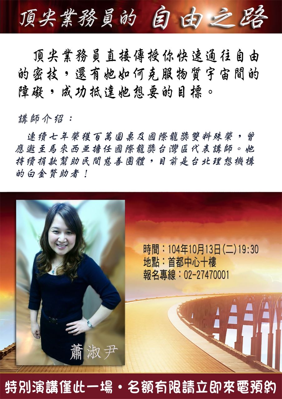頂尖業務員直接傳授你快速通往自由的密技,還有她如何克服物質宇宙間的障礙,成功抵達她想要的目標。特別演講,僅此一場(松山線南京三民站三號出口)TEL:(02) 2747-0001台北市南京東路五段354號1樓