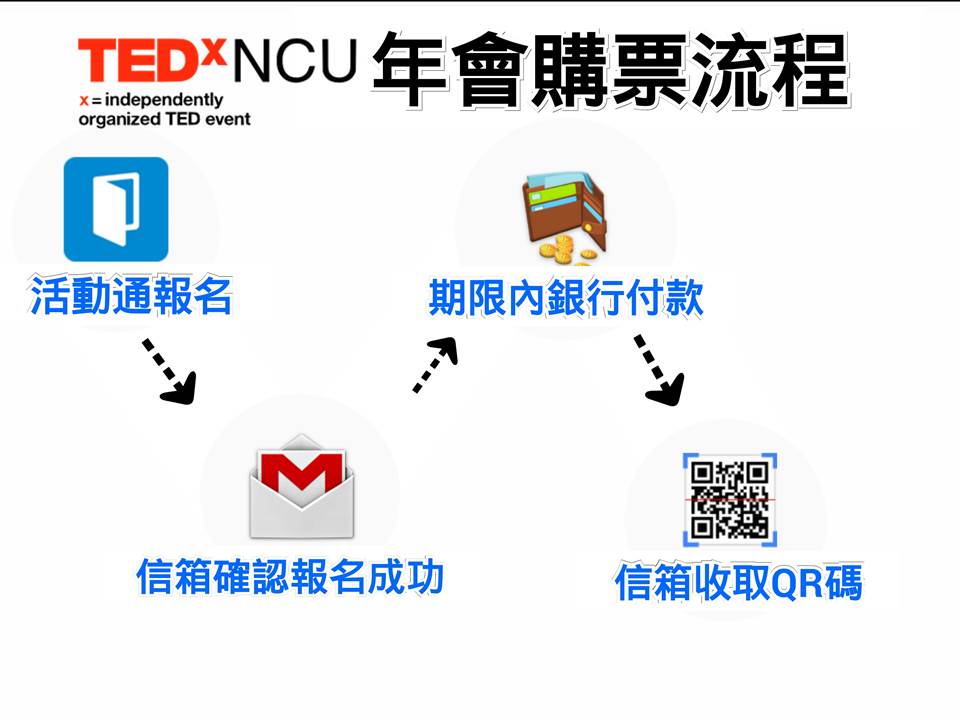 匯款以後,敬請email 至 tedxncu@gmail.com,註明「帳戶名稱」、「帳戶後五碼」、「購票人姓名(購買雙人票,請提供兩人的姓名)」及「匯款時間」,