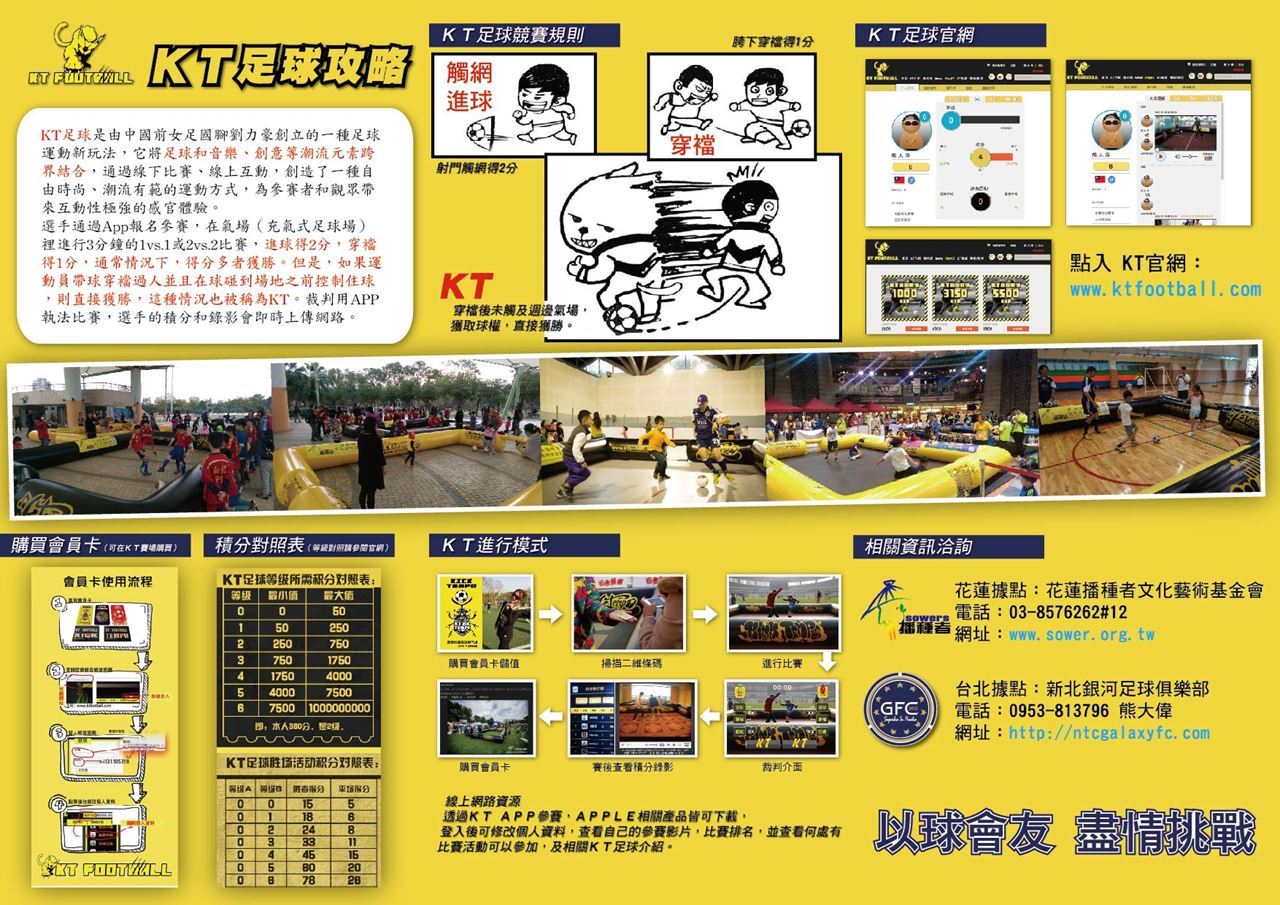 ◎凡參加親子競走比賽的親子們,到KT足球區參加活動,均可獲得價值250元會員卡一張,親子必須現場參加KT足球比賽,會員卡內已儲值可踢10場)