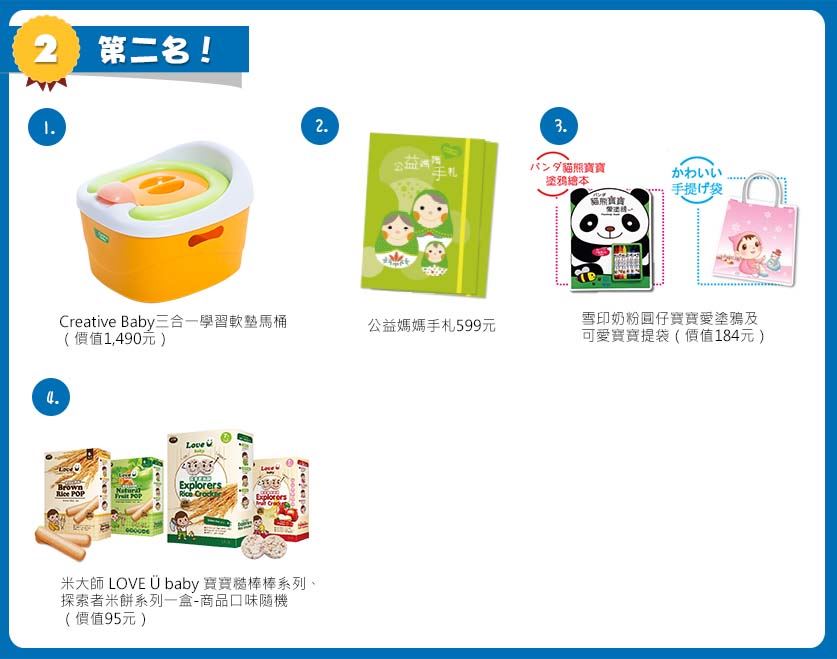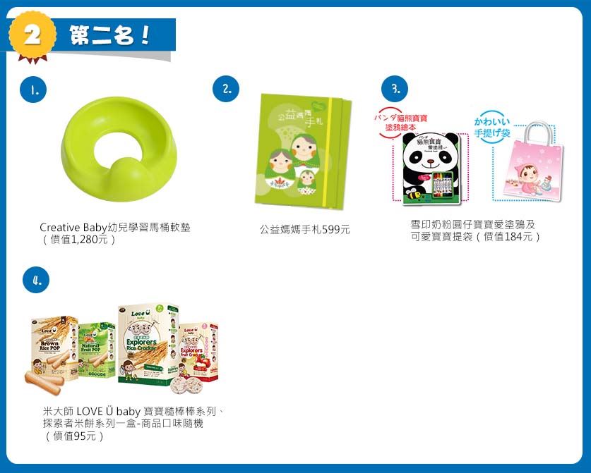 第二名:Creative Baby三合一學習軟墊馬桶(價值1,490元) + 公益媽媽手札(價值599元)+雪印奶粉圓仔寶寶愛塗鴉及可愛寶寶提袋(價值184元)+米粉兒 天然純米粉(價值198元)= 總價值:2,471元