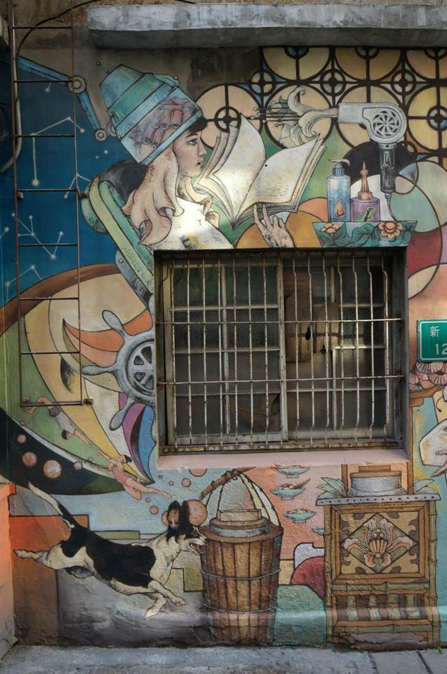 你看出來了嗎? 下圖展現早期百業興盛,理容院印象也展現在創作中這種穿越時空的手法,象徵著新舊的交替