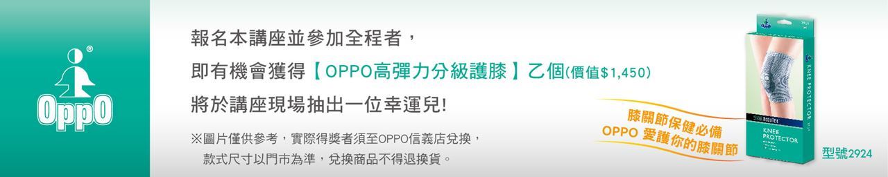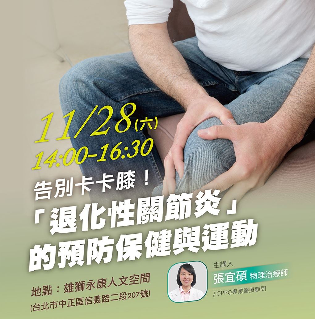 11/28(六),將由OPPO醫療顧問張宜碩物理治療師,告訴您膝關節的預防保健重點,帶您一起「告別卡卡膝!」,歡迎對關節保健有興趣的人報名參加!
