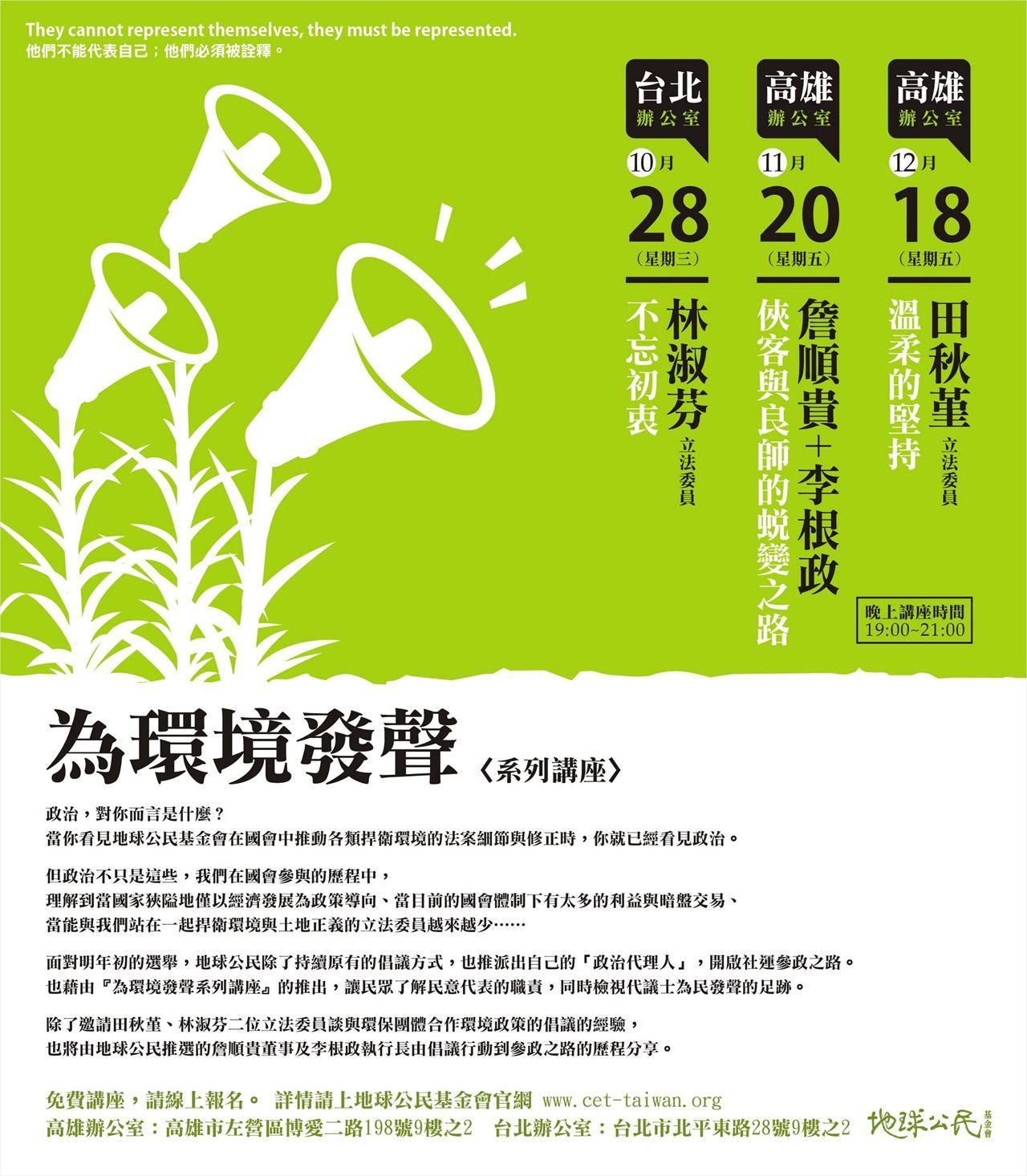為環境發聲系列講座期待民眾能有更多機會認識:秉持為民服務的初衷、和人民站在一起的立法委員。歡迎大家一起聆聽,林淑芬委員爭取環境正義的生命經驗以及與NGO的合作歷程分享。