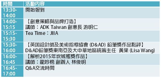 聽ADK Taiwan創意長分享策略面到創意思維,以及龍吟榜創辦人林俊明用評審角度分析2015年坎城獲獎作品及創意訣竅!