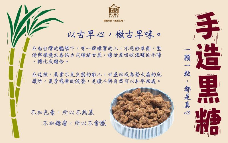 台灣唯一台灣安全農法認證,小農契作白甘蔗手工製作,友善環境種植不用除草劑不用農藥,來自螢火蟲的故鄉好山好水,人工榨取第一道甘蔗汁熬製,不含任何人工香料以及色素香精,非一般低價還原加工黑糖,《三大安全保證》1.通過安全農法認證。2.SGS安全檢驗。3.投保2000萬產品責任險。