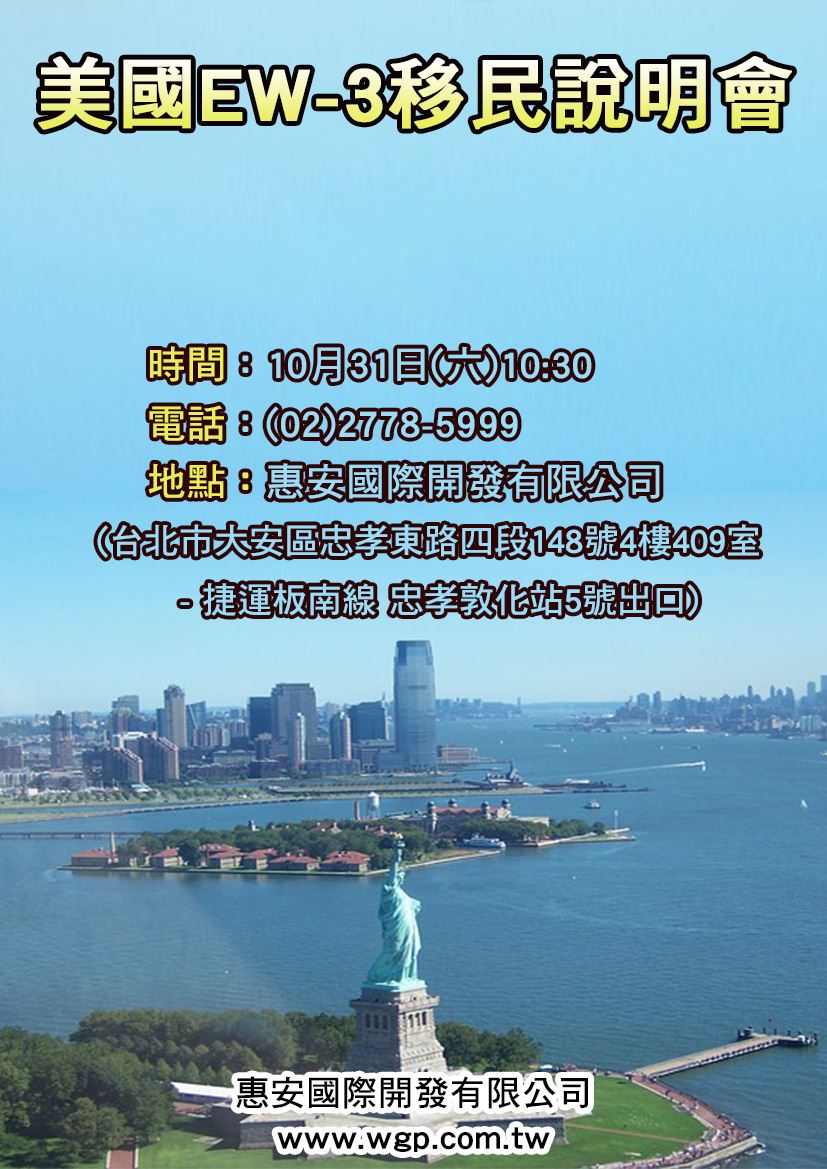 惠安即將在2015/10/31(六)上午10:30,在惠安台北總公司4樓辦公室舉辦美國移民EW-3說明會,對移民美國有興趣的朋友們,都可以透過這場說明會來獲取相關的資訊,請撥打(02)2778-5999找Jamie 沈小姐報名!說明會是免費的,位置不多,請儘早報名!