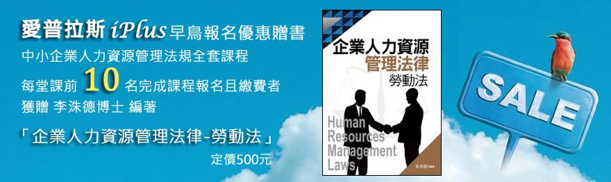 [早鳥報名優惠贈書]限中小企業人力資源管理法規全套課程,每堂課按報名順序前10名學員完成報名且繳費者,即可獲贈由李洙德博士編著的「企業人力資源管理法律-勞動法」(定價500元)一書。