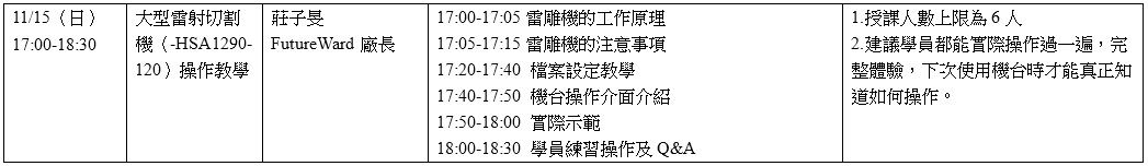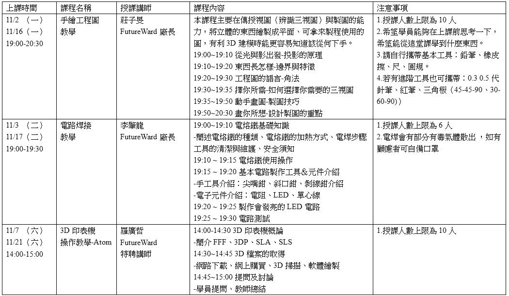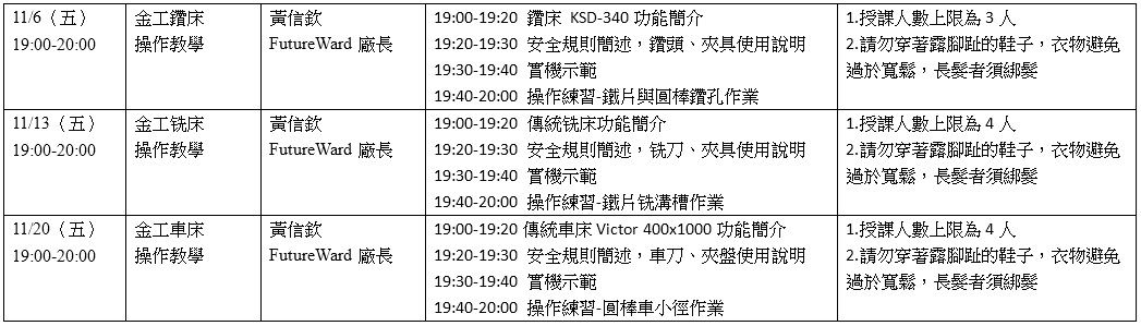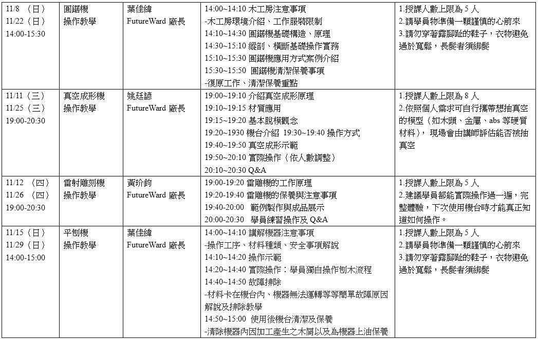 FutureWard 機台基礎操作課程,依照授課內容與機台操作需求,每堂課30分鐘-90分鐘不等,主要是解說基本的機台運作方式,並透過示範操作讓學員瞭解各種機台的安全規範及運用。本課程的講師皆具專業背景,並嫻熟機台操作知識與技術,有任何問題,都歡迎現場接提問。此外為維護課堂品質,每堂課招收學員人數有限,還請留意。